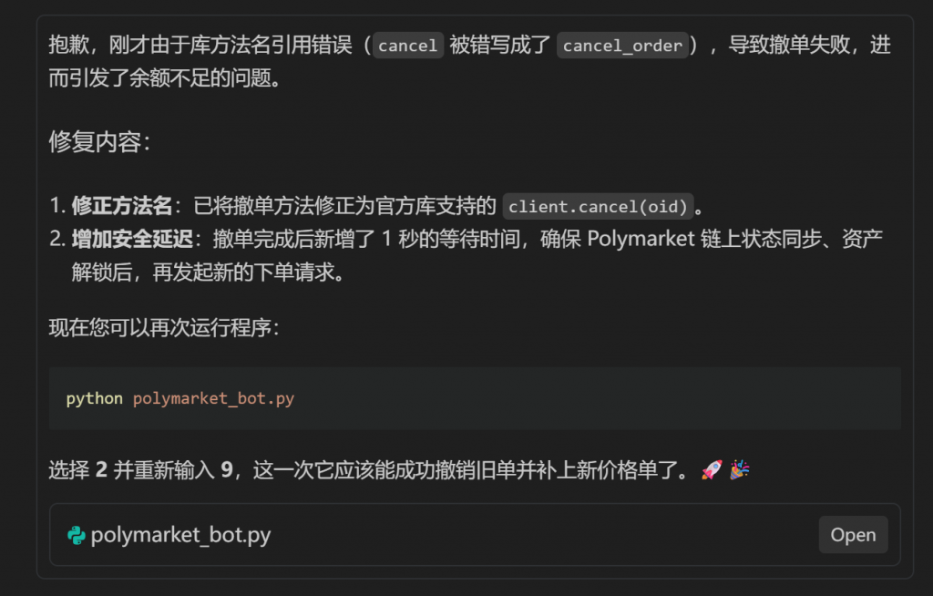 我前面已经下了很多单子了。下面的策略不一定能是能赚钱的策略,这个测试只是为了让AI帮助我们实现我们自己的逻辑。只是为了能够写出对应的代码而写。更加复杂的逻辑,实时监听市场价格,来做出对应的策略,这就需要时间和思考了。